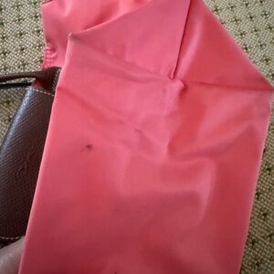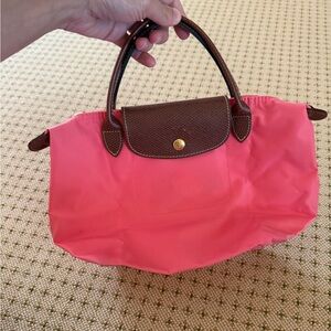 I originally bought this at a Longchamp outlet years ago. Color is a lipstick pink. Zip top, leather handles and flap. There are some marks on the outer and inner of the bag. Please look at all the pictures!
