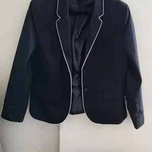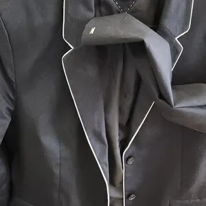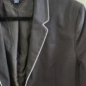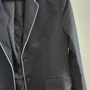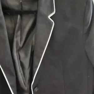 Elevate your style with this sleek black blazer featuring a striking white trim. Perfect for any formal occasion.