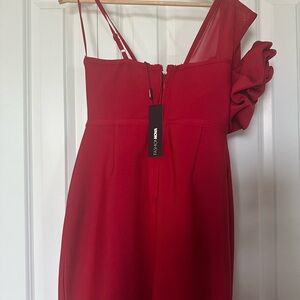 This elegant red cocktail dress by Fashion Nova showcases a chic one-shoulder design with a dramatic ruffle detail. Its form-fitting sheath silhouette and sleeveless cut make it ideal for sophisticated events. The vibrant red hue adds a bold touch to its classic style.