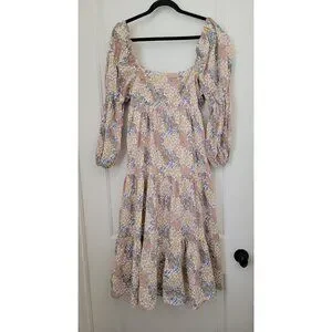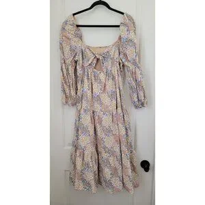 STORIA Floral Puff Sleeve Midi Dress With Back Tie & Tiered Skirt Women's Sz M