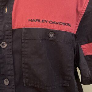 This Harley Davidson Canvas Button Up Shirt in size M features short sleeves, a vented design, and embroidered accents. Made of polyester, the black shirt is perfect for those who appreciate the brand's classic and biker-inspired style. The regular fit and button closure make it a comfortable and stylish addition to any man's wardrobe. Perfect for casual wear, this button-up shirt is a versatile and trendy piece for any motorcycle enthusiast or Harley-Davidson fan.