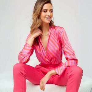 Satin. Flowy fabric. Geometric print. Straight design. Crossed V-neck. Long sleeve. Valentine Collection. Party and events collection.