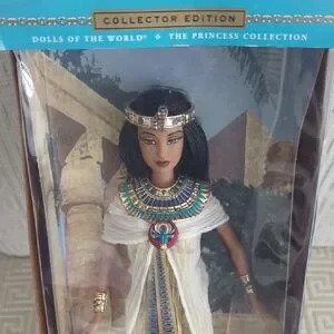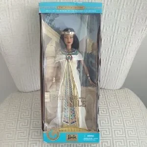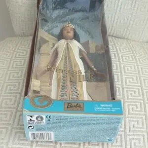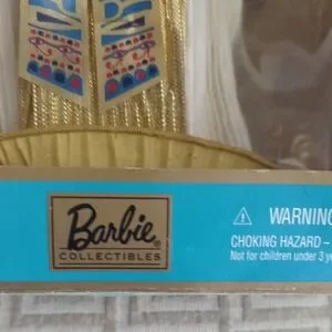 Elegant Barbie doll in white and gold dress. Features detailed accessories and regal design.
