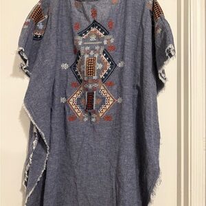Chic denim poncho by Freeway. Features colorful embroidered designs. Ideal for casual wear.