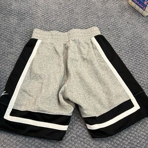 Mix of sweatpant and mesh material. Experience comfort and style with these Nike athletic shorts, featuring a sleek gray and black design. The elastic waistband ensures a snug fit, while the sporty cut offers freedom of movement. Ideal for both workouts and casual wear, these shorts are a versatile addition to your wardrobe.