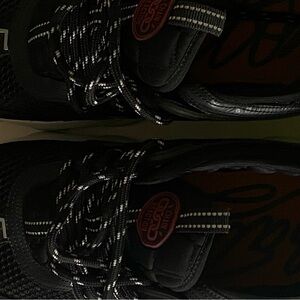 Versace sneakers featuring a striking black and white design. Red accents add a bold touch. Crafted with premium materials for style and comfort.
