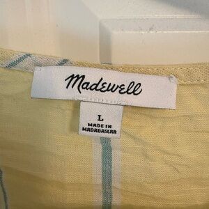This Madewell blouse features a relaxed, boxy fit with a stylish tie front and a mandarin collar. The butter yellow color and short sleeves make it perfect for warm weather, while the lightweight fabric ensures comfort throughout the day. Excellent used condition.