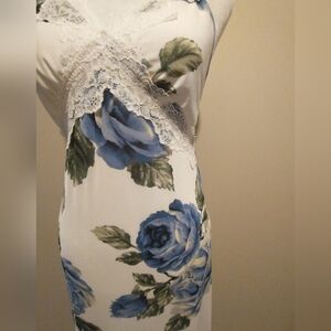This stunning maxi dress is perfect for a wedding guest or resort wear, featuring a sleeveless design with elegant spaghetti straps. The dress boasts a captivating blue floral pattern on a white backdrop, offering a chic and timeless look. Its full-length silhouette ensures a graceful presence at any occasion. It is fully lined. The material is super soft and comfortable!