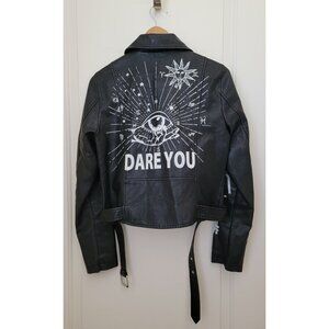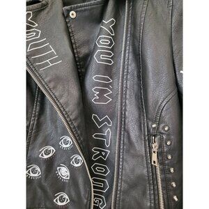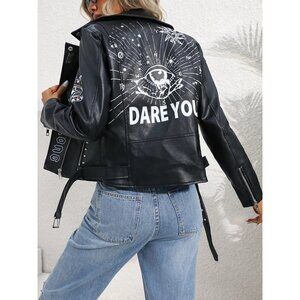 Stylish faux leather moto jacket featuring bold graphic elements and empowering text. Perfect for making a statement while staying effortlessly cool.