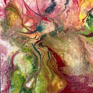 Enhance your space with this vibrant 5x7 abstract canvas board art. “Pink Volcano” Featuring a stunning blend of red, green, and gold hues, this piece adds a touch of elegance to any room.
