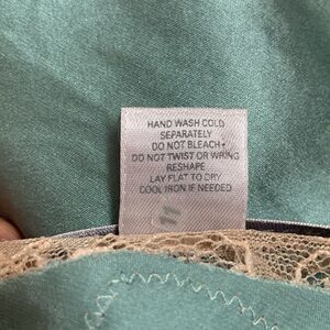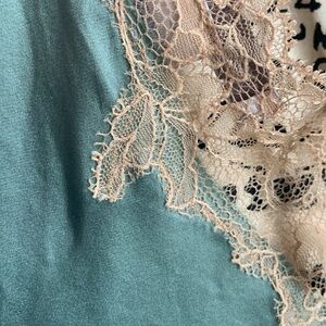 Gorgeous jade color with champagne lace, 16” at empire waist (under bust), 22” at widest part of hip area, about 35” long (depending on how straps are adjusted). EUC