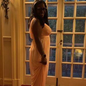 This floor-length blush/peach gown features a flattering empire waist, soft pleated flowy skirt, and v-neck bodice with wide straps for added support and comfort. The fabric drapes beautifully and moves effortlessly—ideal for dancing the night away or walking into any room like you own it.