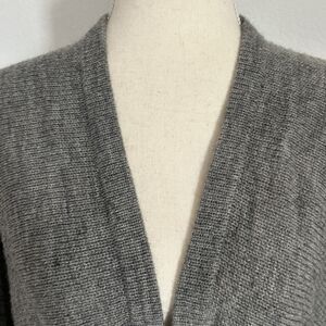 Beautiful fringed shawl made from extra soft alpaca yarn in solid neutral grey. This drapes across the shoulders and has a long, flowing fit with a wispy fringe around three sides. It's in excellent condition with minimal use.