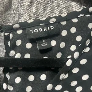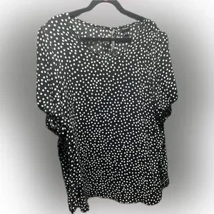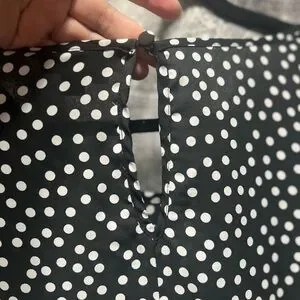 Elegant black blouse with white polka dots. Short sleeves and relaxed fit. Ideal for casual or formal wear.