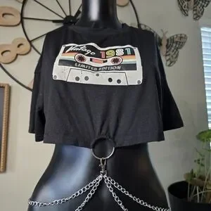 It’s giving Y2K rockstar energy 🖤 This black cropped tee features a vintage cassette tape graphic with "1981 Limited Edition" print, plus a silver O-ring and chain harness detail at the hem. Stretchy, lightweight, and made for styling with high-waisted jeans, faux leather, or festival fits. Gently worn and in great condition.
