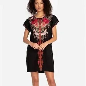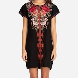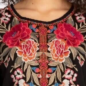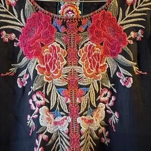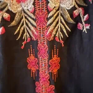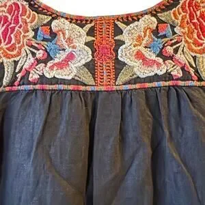 Embroidered linen tunic dress. Color is black with multi color floral embroidery. Unlined. Side slits.