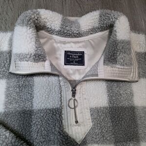 Abercrombie & Fitch 1/4 zip pullover womans size M. Buffalo Plaid Grey and off white/cream.It has the kangaroo pockets. N8ce warm sherpa sweater. In great used condition. Armpit to armpit is 23 shoulder to bottom is 27.