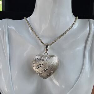 VTG: Bold, beautifully crafted ITAOR Italy sterling silver textured pendant diamond cut necklace features a large puffy heart with ornate etched detail & a matte satin finish. Paired with a sparkling Italian-made rope sterling silver chain, this set is both timeless & elegant. Together, they create a standout statement piece that’s substantial in weight & rich in craftsmanship.
