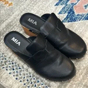 Stylish black leather (faux-man made) clogs by MIA. Features wooden heels and metallic stud accents.
