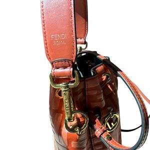The Fendi Mini Mon Tresor Bag in Brick from the 2020 collection. Orange embossed leather with gold tone hardware and drawstring closure. Can be worn as a cross body with long strap or bucket bag with top handle.