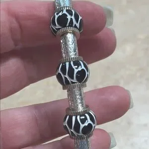 Elegant silver bracelet featuring black and white patterned beads. Perfect for any occasion.