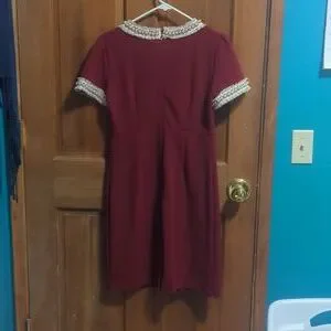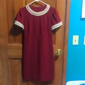 Chic burgundy midi dress by Betsey Johnson. Size 4. Features elegant cream trim with silver bead embellishments plus faux pearls and diamonds on neckline and sleeves. Ideal for stylish outings. Feminine tailoring gives a tasteful fit to your waist, bust, and back.