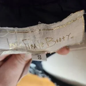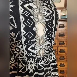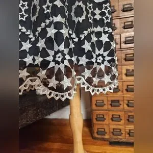 • Jens Pirate Booty Starlight Mini backless Dress, halter style, abalone disc shell button at back of halter, black lace/mesh overlay, with silver embroidered designs, cutouts doen center bodice, fit and flare, hidden back zipper. Cotton with nylon mesh. In excellent condition! Such a gorgeous dress, super flattering on. I love the mesh hem overlap.