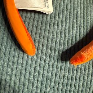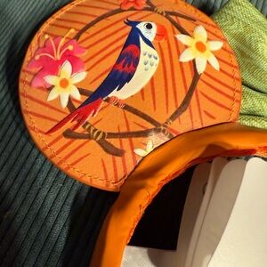 Bright orange headband with parrot-themed ears. Features a green bow for a fun look.