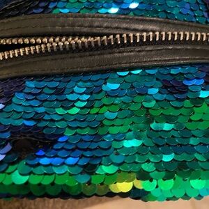 Shimmer with style using this stunning mermaid sequin bag. The vibrant green and blue/purple mermaid colors create a captivating look. Zipper closure. Super cute cosmetic bag.
