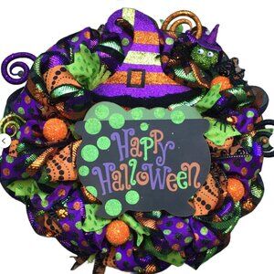 This wreath is made with black, purple, orange, and lime green striped deco mesh and purple ribbon with orange, black, and lime green glittery polka dots. Witch cauldron wreath attachment says Happy Halloween and a witch hat. 24"
