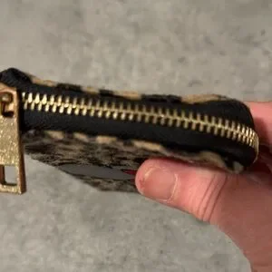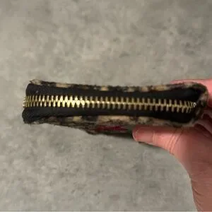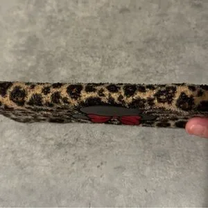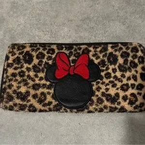This is Super Cute DISNEY Minnie Mouse Fuzzy Wallet.. Tan n Black Cheetah Print wallet. Black Minnie head with big red bow on top of her head. Black interior. DISNEY Tag inside.. Interior has 8 credit card holders. 5 seperate areas for papers or cash.