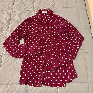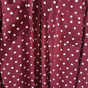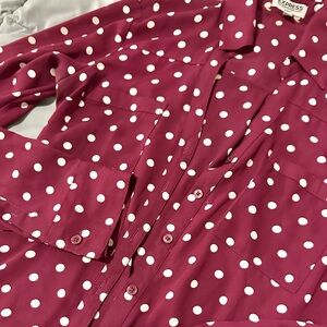 Express Burgundy Polka Dot Portofino Shirt. Colors are burgundy & white. In excellent used condition. Buttons in the front, patch chest pockets, long convertible sleeves with rolled tabs, buttoned cuffs. Slim fit & polyester. Size XS