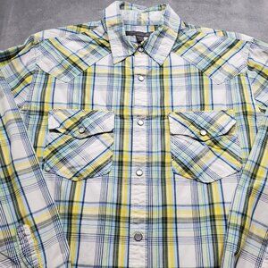 Old Navy Button Down Long Sleeve Plaid Snap Shirt Navy Blue Yellow White Men SzM
