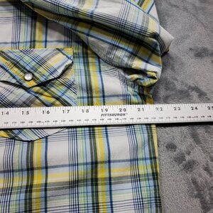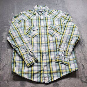 Old Navy Button Down Long Sleeve Plaid Snap Shirt Navy Blue Yellow White Men Sz M