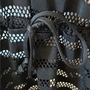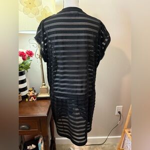 Calvin Klein Swim Black Mesh Cover-up. Black mesh striped dress, with adjustable drawstring at hips, 2 front pockets. Pre loved and in very good condition, mesh material attracts fuzzies. No stains or rips. Size XL. Measures- pit to pit- 25 inches, waist- 24 inches, hips- 25 inches. Length is 35 inches.