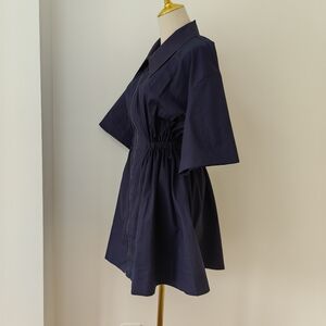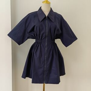 The Evander Mini Dress from Clea is crafted from crisp polished cotton with a smooth finish in a rich toffee hue. This mini-length silhouette features a low neckline, exaggerated collar, and a chunky front zipper with a statement puller. The waist is softly cinched with an elasticated channel, creating gentle volume through the body.