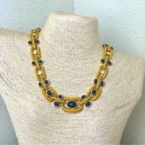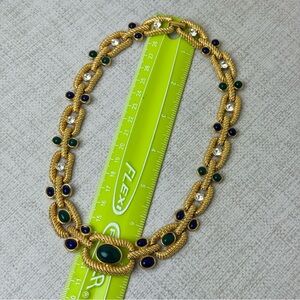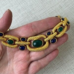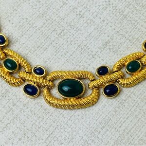 This necklace features green and blue cabochon stones and clear crystals. Signed CH. Beautiful vintage condition. Measures approx 17”. Please see photos for details. Offers welcome.
