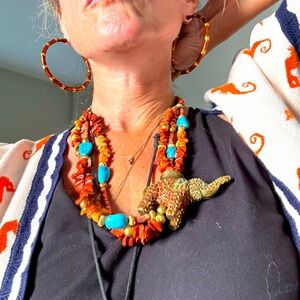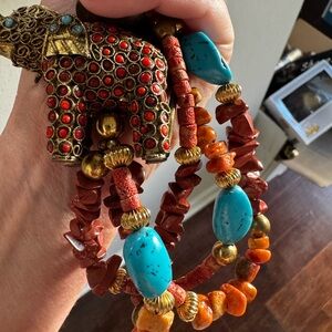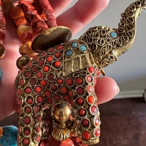 Vibrant necklace with elephant pendant. Features red, orange coral and turquoise beads. Unique and eye-catching design. It is the most exquisite piece. From my Great Grandmother’s Personal Collection ❤️