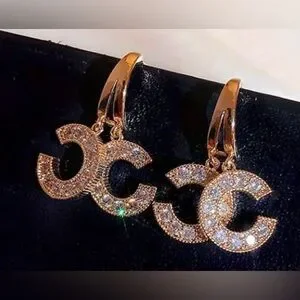 NEW CC Elegant Earrings Luxury Fashion Gold Tone with Rhinestones Letter Studs Dangle - 2 C's