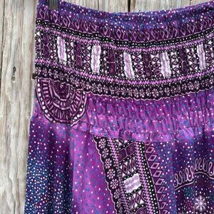 [New without tags] Beautiful 100% Cotton Drop Crotch Harem Pants by Harem Pants. Size Small-Medium. Elastic smocked waist can be worn at hips, waist or bust. Purple/blue/black/white stunning Mandala pattern! Excellent new condition. Smoke and pet free environment.