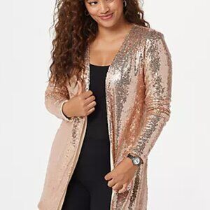 Open front, all over sequin detail, long sleeves, straight hemline, fully lined