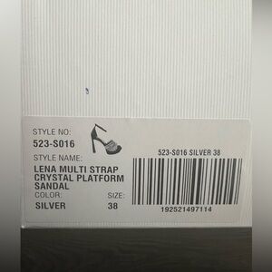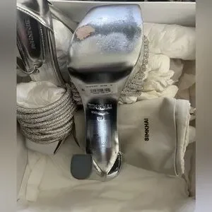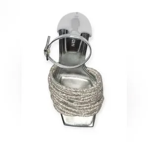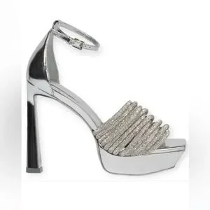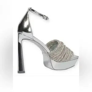 Elegant silver heels with a stylish ankle strap. Features a textured front band. Ideal for glamorous events. Worn Once!