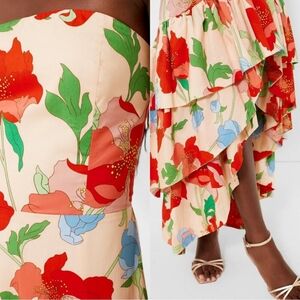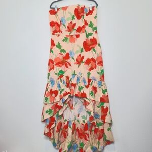 NWT Tuckernuck Hyacinth House Red Multi Floral Strapless Malory Dress. Hi-low. Ruffles design. Smocked zipper back. Strapless.