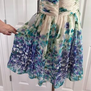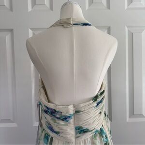 This is a brand new with tags (NWT) Adrianna Papell Evening dress, perfect for any special occasion. It's a gorgeous and feminine halter dress featuring a pleated bodice and a beautiful watercolor floral print in shades of purple, blue, teal, and green. The skirt is a stylish high-low cut, revealing a solid white lining underneath, which adds a flirty and fun silhouette. The fabric is a lightweight, flowy chiffon, making it comfortable to wear.