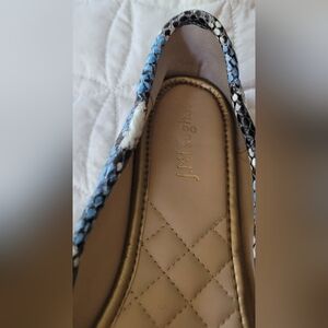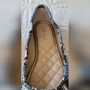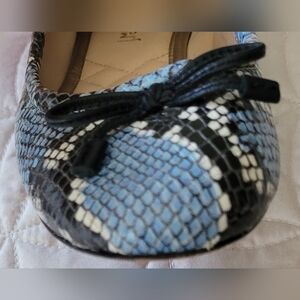 Size 7 Mclaughlin Mercer Ballet Flats with a snakeskin pattern. Light previous use. The bottoms show wear and tear. Inside and remainder of shoe show very little wear and tear. Bows are securely attached to the shoes. There are no visible scuff marks, holes, or damage to the upper portion of the shoes. Overall, they are in very good condition. Box is not included. Smoke-free and Pet-free environment.