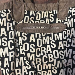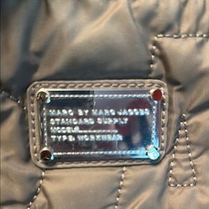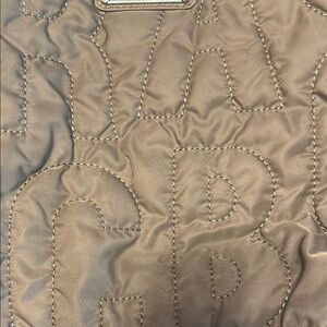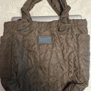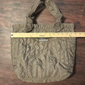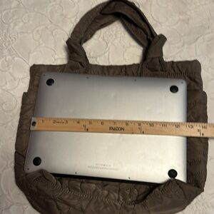 Stylish and versatile quilted tote bag in a taupe/mushroom/brown color. Perfect for everyday use.super cute inner lining. 2 small inner pockets as shown: I zipper inner pocket as shown. Two side outer pockets as shown. Bag is a bit darker than shown in photos. Bag was turned inside out to show inner lining. See all pictures. Please ask if questions. Will fit the laptop as shown. This laptop measured will go all the way down to the bottom of the bag just showed it sticking out to show that it will fit.