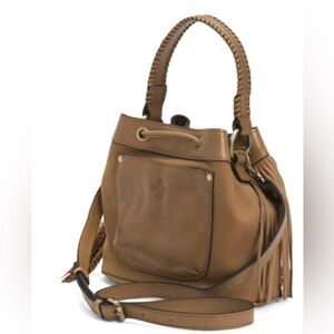 This stylish mini bag from Patricia Nash showcases a boho-chic bucket silhouette crafted from supple brown leather. Adorned with playful fringe tassels and a practical drawstring closure, it offers a versatile and earthy tone perfect for casual outings.