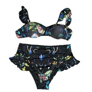 SOLD Women’s L Two Piece Bathing Suit Lunar Moth Mushrooms Padded Ruffle Accents