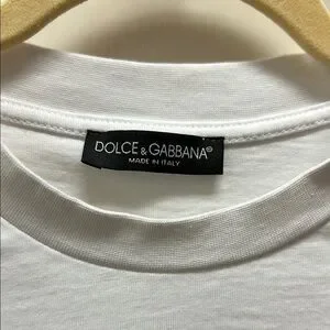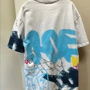 Vibrant graffiti design on a white Dolce & Gabbana t-shirt. Features red, blue, yellow, and black elements.