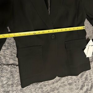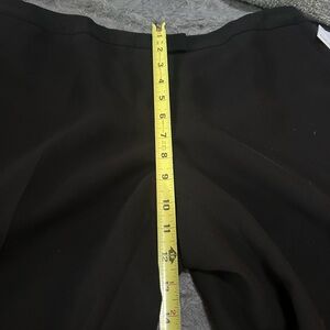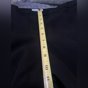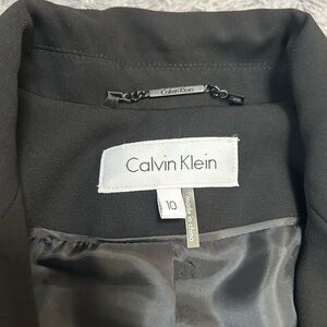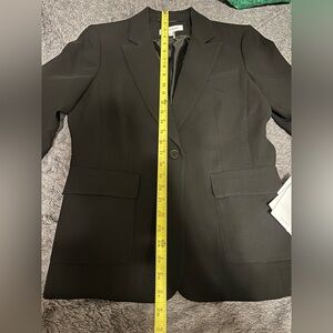 This Calvin Klein black pantsuit features a tailored blazer and full-length dress pants, crafted from a formal suiting material for a sleek, professional look. Ideal for business settings, the classic cut and solid color ensure a timeless appeal. Never worn. Pics added of some measurements: Natural waist about 17 1/4”; length 41 1/4”; crotch seam about 9 1/2” but measured from waistband to crotch is about 12”. Not sure how to best report that. It’s a Calvin Klein size 10 never worn, never tailored, never laundered, so it will fit true to their size.